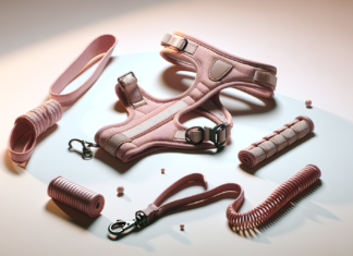 A Dog harness is equipment consisting of straps of webbing that loop nearly around—and fasten together using side release buckles—an animal’s torso, typically a quadrupedal mammal such as a dog or cat.
