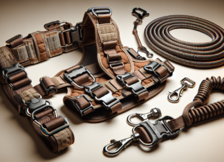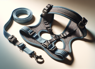 A Dog harness is equipment consisting of straps of webbing that loop nearly around—and fasten together using side release buckles—an animal’s torso, typically a quadrupedal mammal such as a dog or cat.