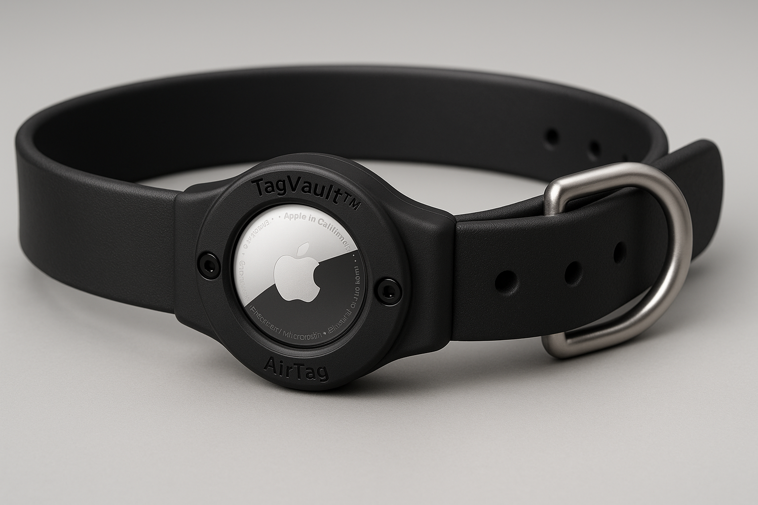 The TagVault is designed so the AirTag’s Bluetooth signal is unaffected — the composite and Nylon6 materials are chosen specifically to avoid signal attenuation. Fit notes: it accommodates collars up to 0.20″/5mm and sits flush on most harness attachment points; it may sit slightly proud on very narrow/8″ decorative collars but still functions.